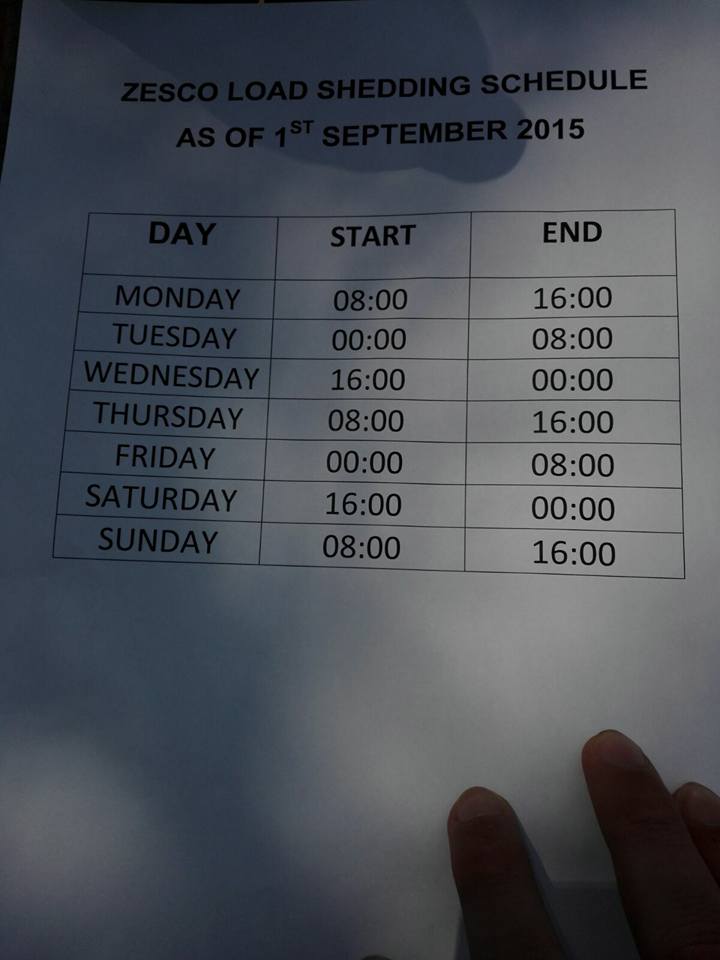 Ondertussen is Gert al een week in Kabwe, Zambia. Maandag is de training begonnen. Het zal een intensieve tijd zijn voor Gert, met een programma van 5.00 – 21.00u. Daarnaast deelt hij deze periode een kamer met 3 anderen, dus ook dat zal wennen zijn en niet altijd even leuk. En dan is er nog het schema wat aangeeft wanneer er geen stroom en kraanwater is, maarliefst 8 uur per dag! Hierbij enkele foto’s.